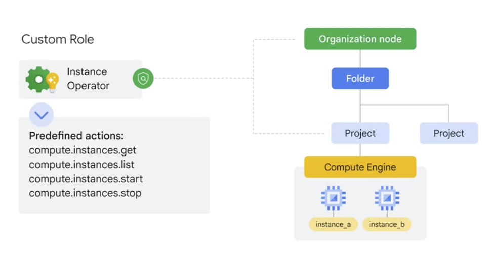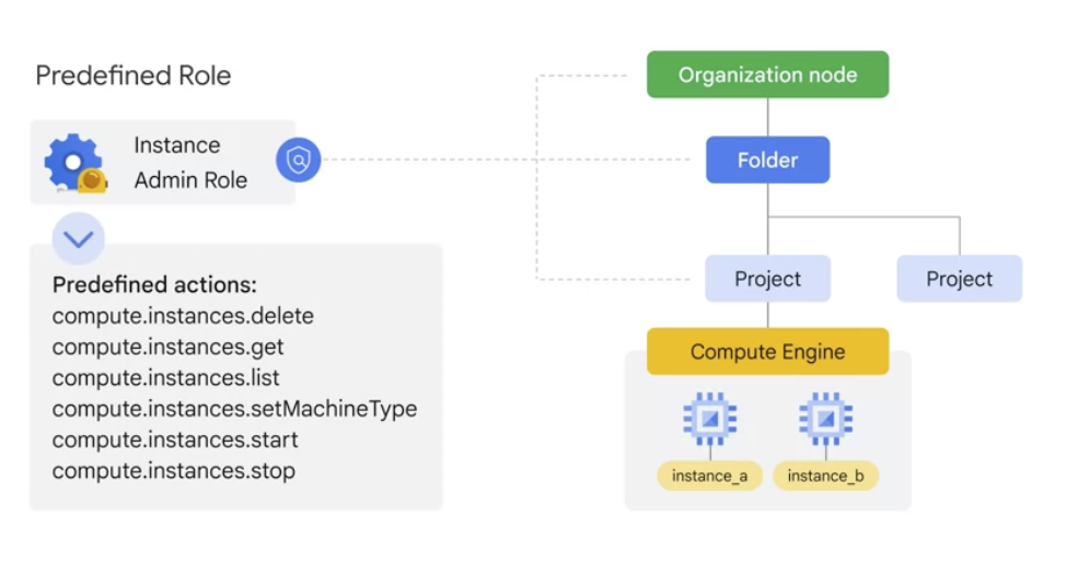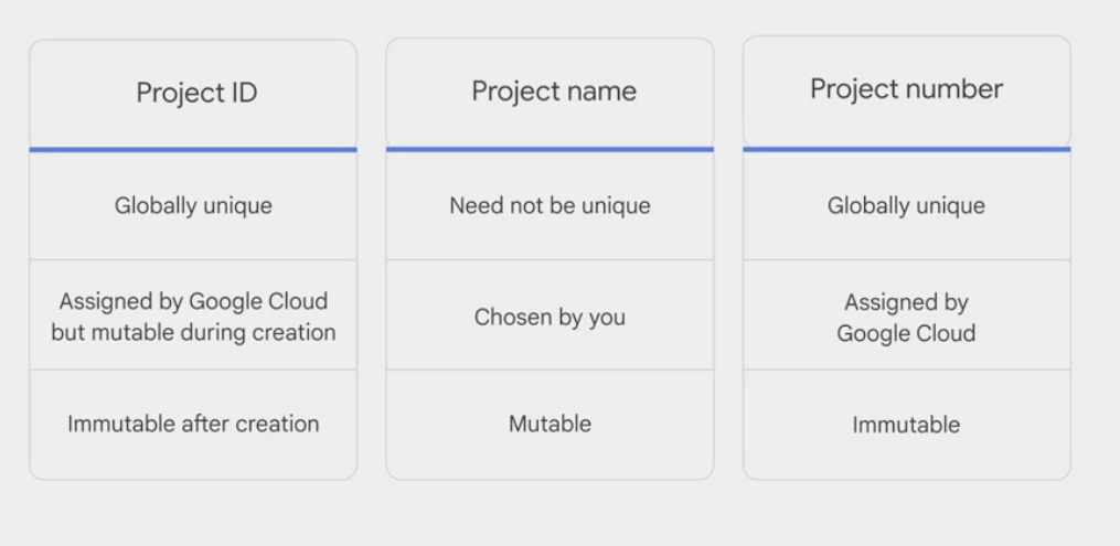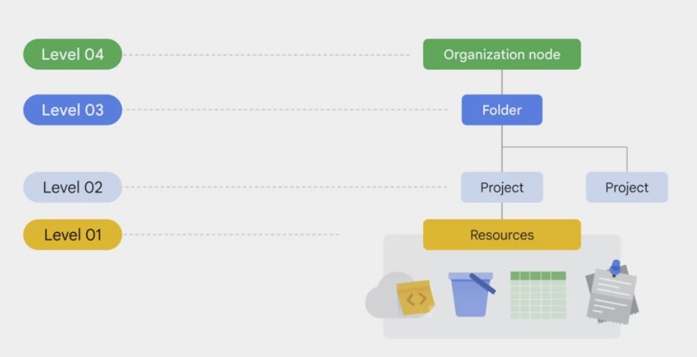 Resourcesin Google Cloud represent virtual machines, Cloud Storage buckets, tables in BigQuery, or any other component in Google Cloud.Projectsare the second level in the resource hierarchy and are used to enable and manage Google Cloud services, such as APIs, billing, collaborators, and other Google services.Foldersallow for the assignment of policies and permissions to resources at a granular level.- can contain projects or other folders, and resources within a folder inherit policies and permissions from that folder.