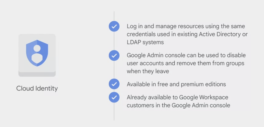 Admins can log in and manage Google Cloud resources using the same usernames and passwords used in existing Active Directory or LDAP systems.