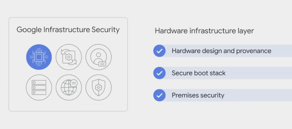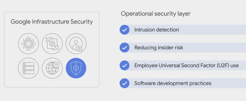 The security infrastructure of Google Cloud and Google services is designed with multiple layers of protection.