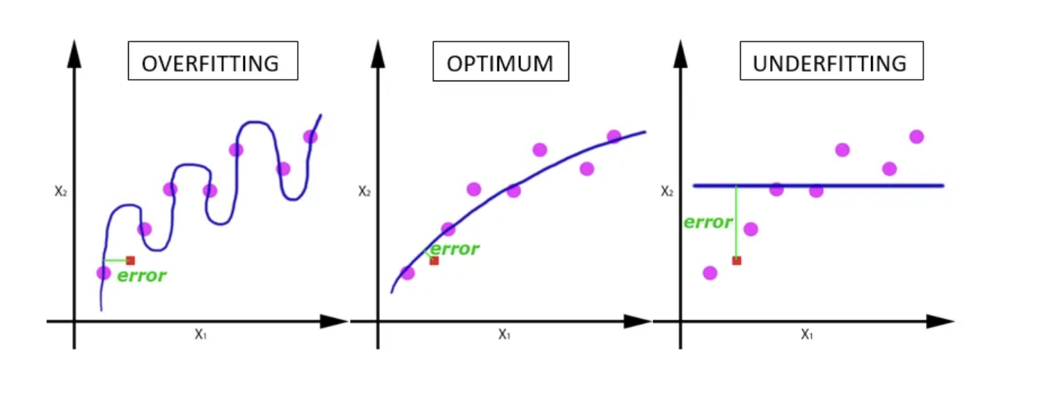 - As the number of epochs increases, more number of times the weight are changed in the neural network and the curve goes from underfitting to optimal to overfitting curve.