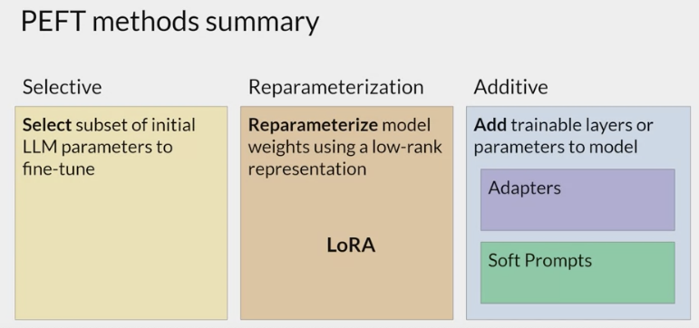 - Reparameterization and Additive are two PEFT methods that adjust or add parameters to efficiently fine-tune models.