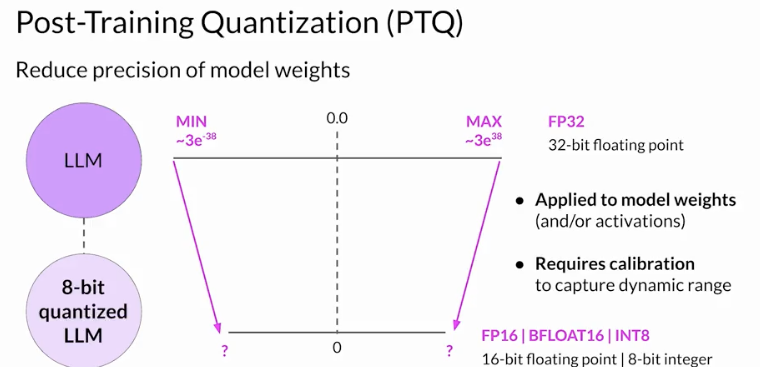 - transforms a model’s weights to a lower precision representation, such as 16-bit floating point or 8-bit integer.