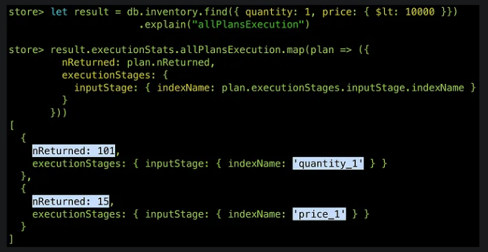 - filters.indexes 此 query shape 的索引数组。查询优化程序仅评估列出的索引和集合扫描,从中选择最佳查询计划。