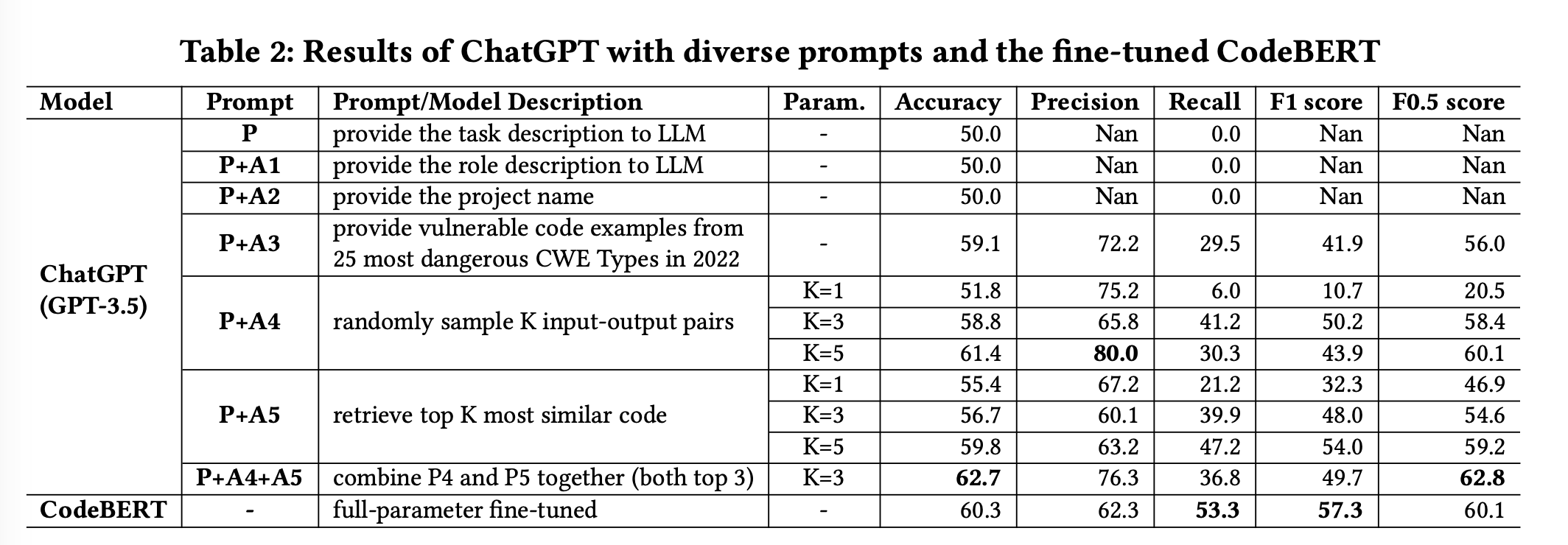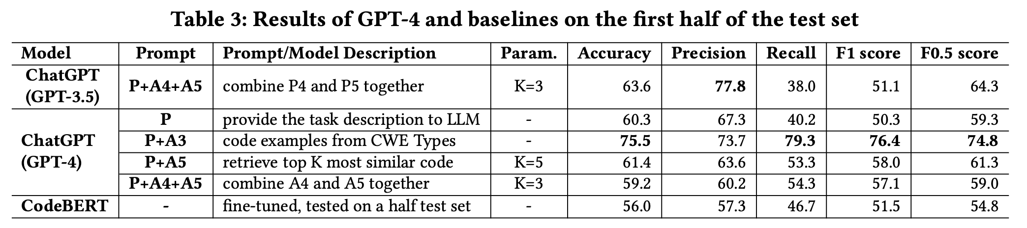 - As illustrated in Table 3, GPT-4 with the prompt P+A3 significantly outperformed the finetuned CodeBERT by 34.8% in terms of accuracy.